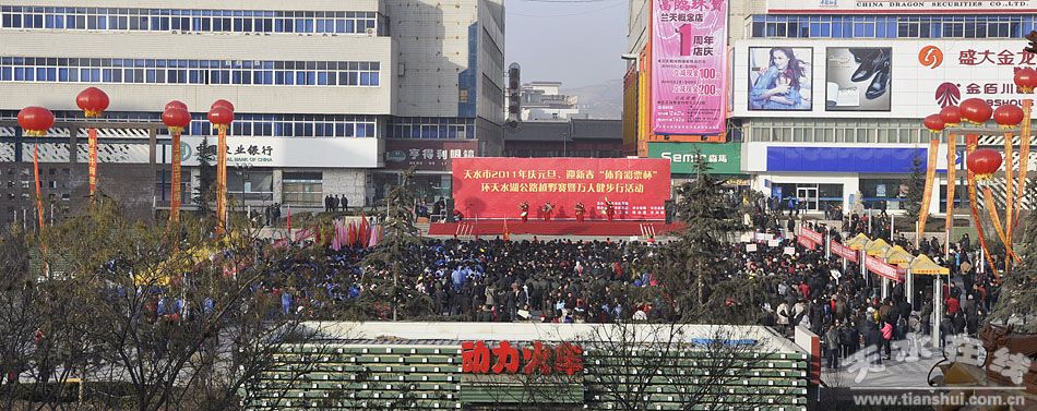 12月30日,由天水市體育局主辦,共青團(tuán)天水市委、天水市教育局、天水市總工會(huì)、天水市婦聯(lián)、天水市公安局、天水市衛(wèi)生局協(xié)辦的2011年慶元旦、迎新春“體育彩票杯”環(huán)天水湖公路越野賽暨萬(wàn)人健步行活動(dòng)啟動(dòng)儀式在天水市龍城廣場(chǎng)舉行,這標(biāo)志著我市2011年全民健身活動(dòng)將全面啟動(dòng)。