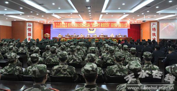 大會(huì)在莊嚴(yán)的國(guó)歌聲中拉開了序幕。首先參會(huì)人員觀看了天水市公安消防支隊(duì)《駐守龍城寫忠誠(chéng)》事跡專題片。當(dāng)一幅幅生動(dòng)地救援場(chǎng)面、一幅幅警民共建、一家親的感人場(chǎng)面、一幅幅打造消防鐵軍的苦練場(chǎng)面出現(xiàn)在人們視線時(shí),所有的參會(huì)人員被深深地打動(dòng)。隨后市公安消防支隊(duì)支隊(duì)長(zhǎng)郭學(xué)鋒作了事跡報(bào)告;市委常委、宣傳部長(zhǎng)王光慶同志宣讀了中共天水市委、市政府授予天水市公安消防支隊(duì)“消防鐵軍·救援先鋒”榮譽(yù)稱號(hào)的決定;韓岱成、王光慶為天水市公安消防支隊(duì)授牌,消防支隊(duì)政委楊華與支隊(duì)長(zhǎng)郭學(xué)鋒邁著堅(jiān)定地步伐走向主席臺(tái)莊重地從領(lǐng)導(dǎo)們手中接過榮譽(yù)獎(jiǎng)牌,此刻間臺(tái)下掌聲雷動(dòng),久久不能停息。