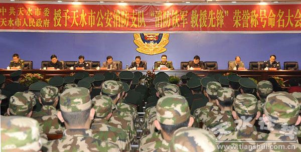 1月6日下午,中共天水市委、天水市人民政府在市公安局三樓會(huì)議室隆重召開授予市公安消防支隊(duì)“消防鐵軍 救援先鋒”榮譽(yù)稱號(hào)命名大會(huì)。消防總隊(duì)副政委瞿新春,市委常委、政法委書記韓岱成,市委常委、宣傳部長(zhǎng)王光慶,市長(zhǎng)助理、市公安局局長(zhǎng)呂淙江,總隊(duì)組教處處長(zhǎng)周明華、市政法委紀(jì)檢組長(zhǎng)兼政治部主任楊迎勛、市公安局副局長(zhǎng)董銀喜,市民政、安監(jiān)、衛(wèi)生、建設(shè)、國(guó)土資源、供電、供水、燃?xì)獾认腊踩I(lǐng)導(dǎo)小組成員單位負(fù)責(zé)同志以及消防支隊(duì)、武警支隊(duì)官兵、市公安局民警300余人參加了大會(huì)。大會(huì)由副市長(zhǎng)雷鳴主持。