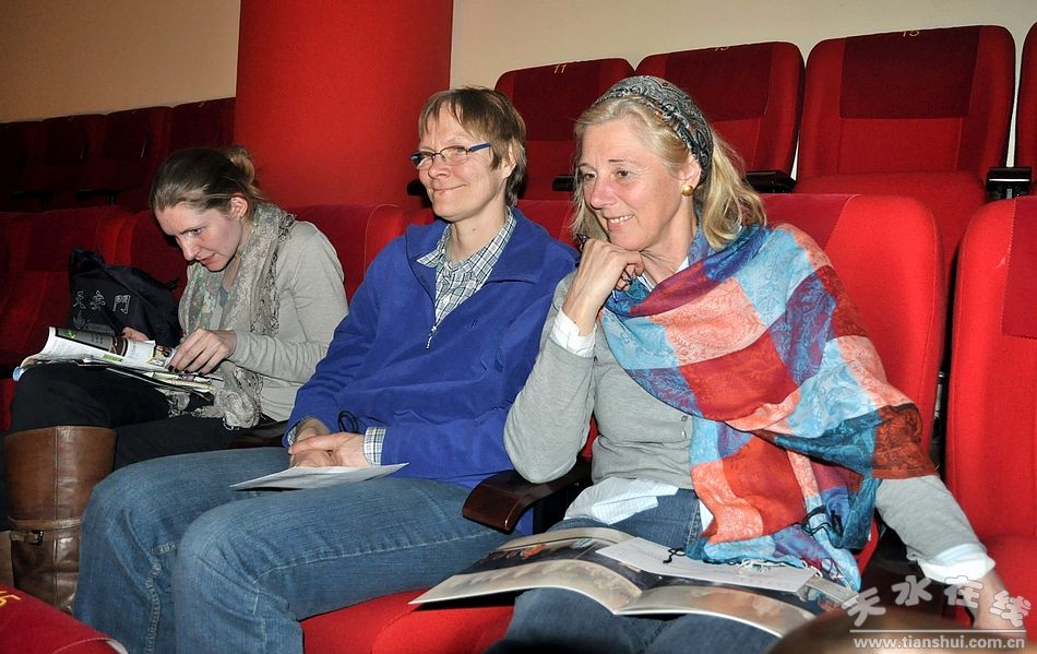 三樓觀眾席上,三位外國女觀眾引起了記者注意。她們時而全神貫注地看戲,時而低頭翻看劇情介紹,時而悉心傾聽翻譯介紹劇情,看到高興之處,還一邊喝彩一邊鼓掌。記者采訪時才知道,她們?nèi)皇堑聡,其中一位女士叫福特曼·胡默爾,是漢堡文化局局長。福特曼·胡默爾告訴記者,她這次來北京考察,僅僅四天時間就深深愛上了中國曲藝文化,碰巧今晚有來自中國西北的秦腔《麥積圣歌》上演,就請翻譯買票前來觀看。