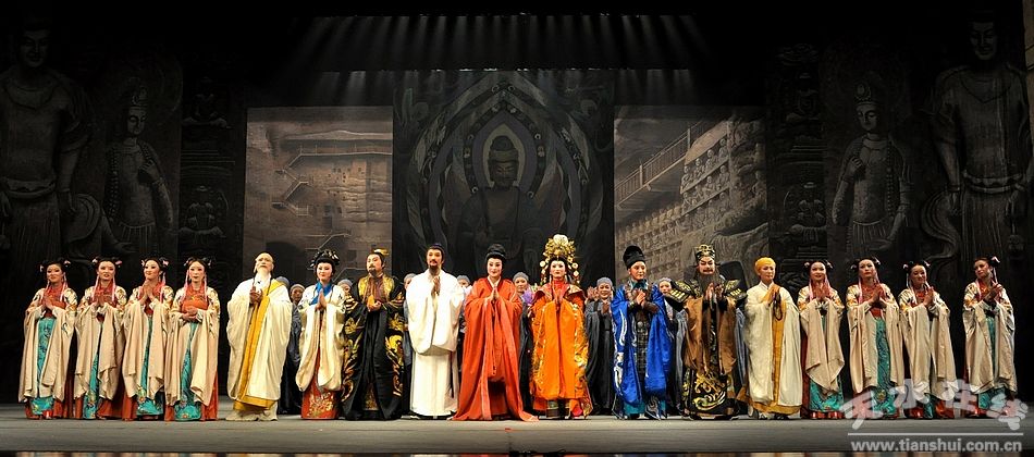 兩個小時的演出,現(xiàn)場觀眾隨著乙佛氏命運(yùn)的悲歡離合和演員精彩的表演,報(bào)以高潮迭起,此起彼伏的掌聲。一位在文化部工作的陜西籍吳先生告訴記者,《麥積圣歌》無論是唱腔、舞美都比較柔和,娓娓道來,聽著很享受。特別是舞臺背景將麥積山石窟藝術(shù)的精華呈現(xiàn)給觀眾,不僅讓我們了解了麥積山石窟一段充滿佛理人生的悲情故事,而且凸顯了麥積山石窟藝術(shù)的輝煌燦爛。遺憾的是自己還沒有去過天水,一旦有機(jī)會,他一定要去看看麥積山這座充滿神奇色彩的藝術(shù)寶庫。