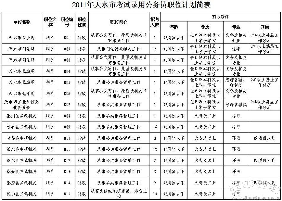 2011年天水市考試錄用公務(wù)員職位計(jì)劃簡(jiǎn)表