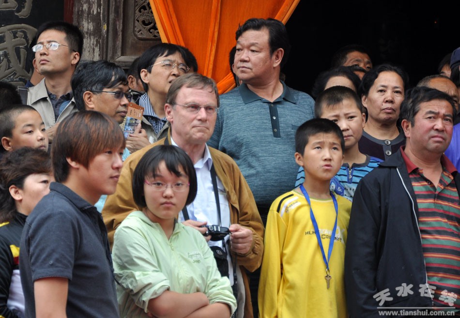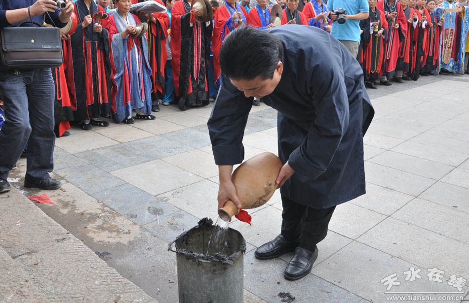 農(nóng)歷七月二十日(公歷8月19日)下午,辛卯(2011)年秋祭中華人文始祖伏羲典禮送神、送圣水、焚榜文儀式隆重舉行。儀式開始后,請方神黑爺進(jìn)入伏羲廟,舉行送神儀式,明燭、焚香、化表、獻(xiàn)茶;然后,在伏羲廟西牌坊前舉行送圣水、焚榜文儀式,將榜文焚燒,與祭文灰、圣水一同送往藉河長流水中。