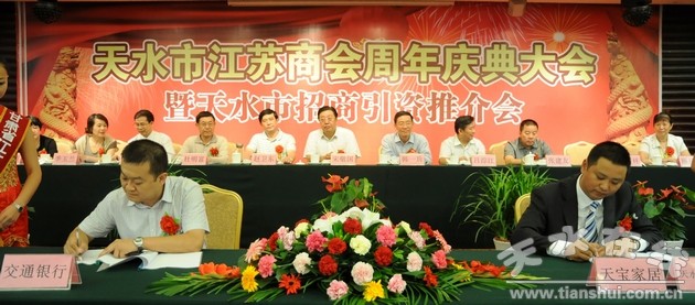 推介會(huì)上,市招商局與陜西省江蘇商會(huì)、寧夏自治區(qū)江蘇商會(huì)、洛陽市江蘇商會(huì)、包頭市江蘇商會(huì)簽訂了委托招商合作協(xié)議;天水市江蘇商會(huì)與建設(shè)銀行天水分行、交通銀行天水分行分別簽訂了銀企合作協(xié)議;總投資2.68億元的4個(gè)招商引資項(xiàng)目舉行了簽約儀式。