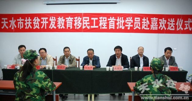 2011年9月11日上午,天水計(jì)算機(jī)專修學(xué)院舉行隆重的儀式,歡送我市“扶貧開(kāi)發(fā)教育移民”工程首批35名學(xué)員赴嘉興。這35名學(xué)員在該院接受了20多天的文化技能培訓(xùn)結(jié)業(yè)后,將離開(kāi)家鄉(xiāng)天水到浙江嘉興繼續(xù)接受職業(yè)技能培訓(xùn)并在當(dāng)?shù)鼐蜆I(yè)、工作生活。天水市人大常委會(huì)主任任伯年、省扶貧辦科教處處長(zhǎng)杜明華、市政府副秘書(shū)長(zhǎng)楊勝利、天水市扶貧開(kāi)發(fā)辦公室主任張棟梁等領(lǐng)導(dǎo)出席了歡送儀式。
