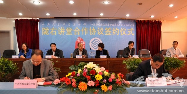 5月3日下午,天水市委宣傳部和中國(guó)移動(dòng)天水分公司合作的“隴右講堂”合作簽約儀式在天水移動(dòng)大廈舉行,市委常委、宣傳部長(zhǎng)彭鴻嘉、中國(guó)天水移動(dòng)分公司、天水日?qǐng)?bào)社、天水電視臺(tái)負(fù)責(zé)人等出席了簽約儀式。