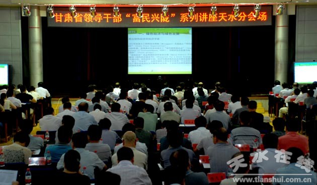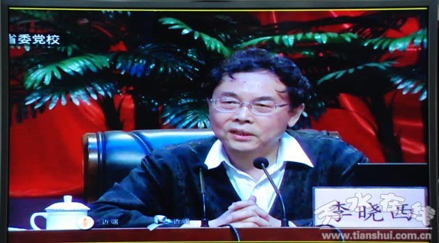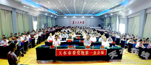 (圖為天水分會場,市領導韓一兵、王欽錫、張克強,市長助理呂淙江,市直機關干部,市委黨校教職工和學員共計500多人在市委黨校分會場收聽收看講座。)