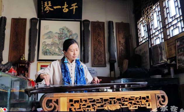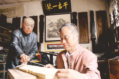 甘肅省天水市麥積山下是伏羲故里,善制伏羲式古琴——斫琴。其制作工序主要為選材、制胚、修面、掏槽、制底以及合琴等節(jié),一把上好的伏羲古琴需要兩三年才能制作完成。圖為當(dāng)?shù)胤俏镔|(zhì)文化遺產(chǎn)傳承人王占云(左)和同伴一起給古琴拉墨線。 (新華社記者 陳斌攝 )