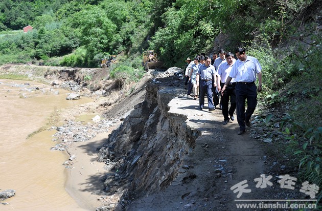 ▲在秦州區(qū)娘娘壩鎮(zhèn)長(zhǎng)河村檢查水毀道路搶修情況
