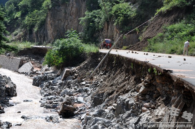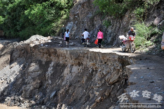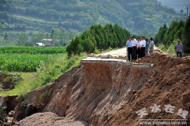 ▲在麥積區(qū)甘泉鎮(zhèn)察看水毀道路情況