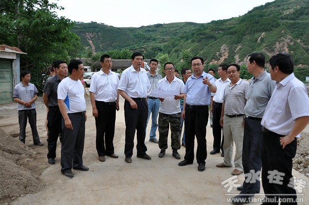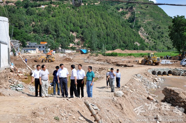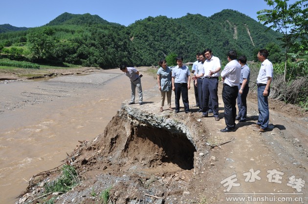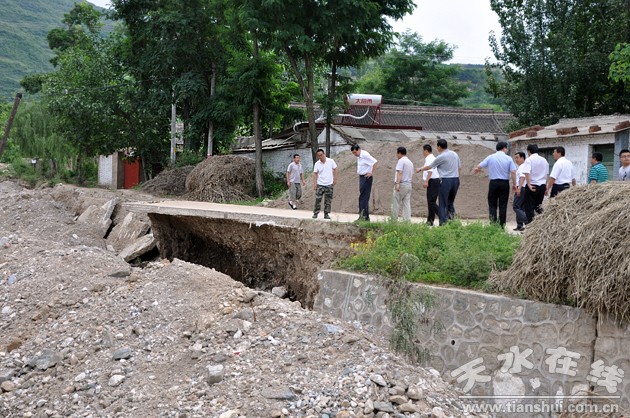 ▲在麥積區(qū)街亭村檢查水毀道路搶修情況