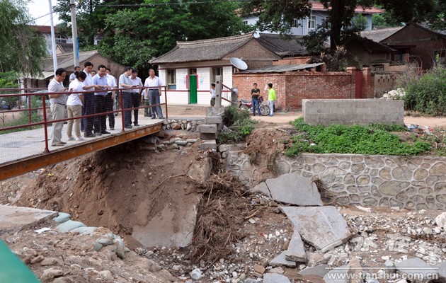 ▲察看麥積區(qū)麥積鎮(zhèn)麥積中學(xué)門(mén)前搶修好的人行便橋