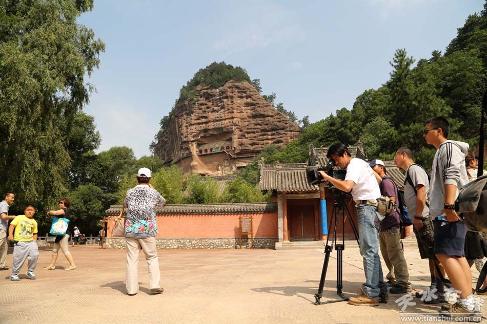 (臺(tái)灣旺旺中時(shí)媒體集團(tuán)記者采訪團(tuán)在麥積山采訪 天水在線8月17日攝)