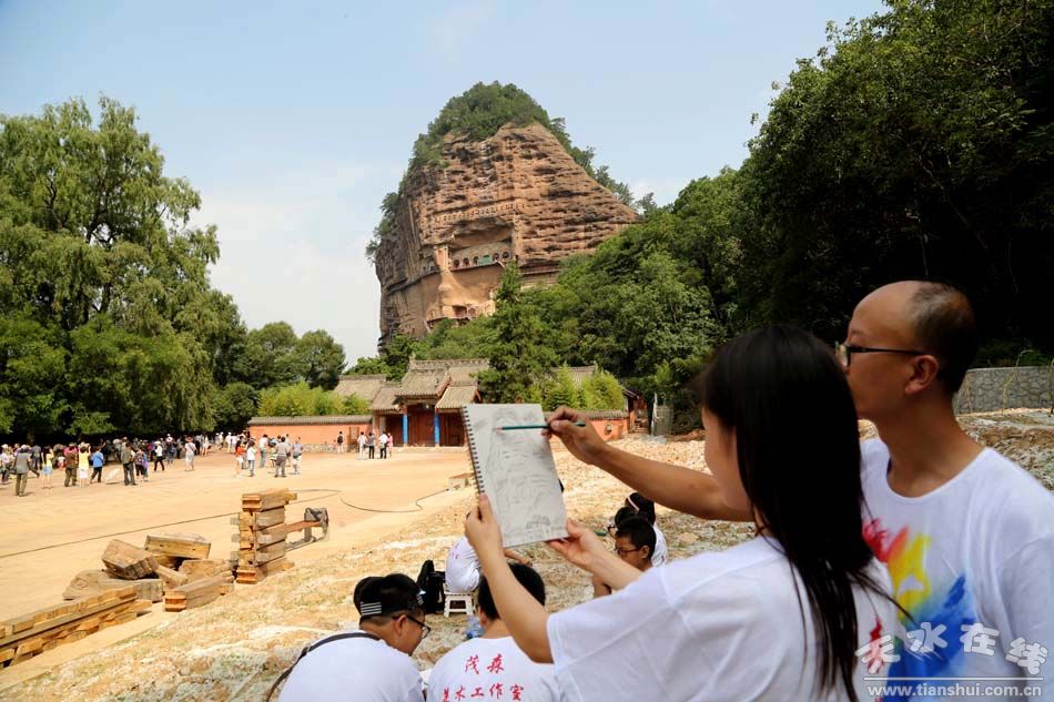 在麥積山石窟廣場記者見到天水茂森美術(shù)工作室郭茂森老師帶領(lǐng)十多名學(xué)生在寫生,記者采訪郭茂森時,他說:“麥積山石窟集北雄南秀風(fēng)光于一體,是祖國的珍寶,是繪畫創(chuàng)作的最佳對象,也是避暑的好地方。我?guī)Ш⒆觽儊磉@里寫生,既能讓孩子們學(xué)到知識,也能在炎炎夏日,讓孩子們感受到世外清涼的仙境!
