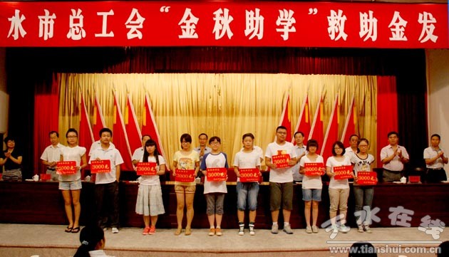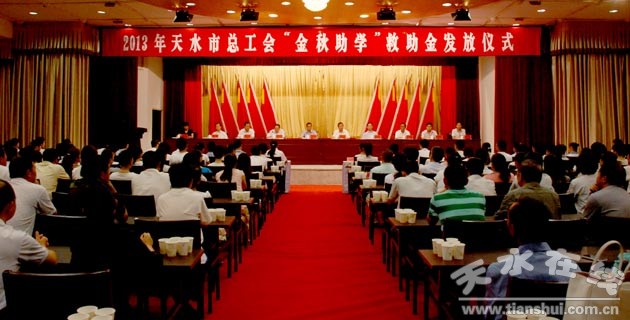 8月21日,天水市總工會舉行2013“金秋助學(xué)”救助金發(fā)放儀式。全市300余名高考被二本以上正規(guī)院校錄取的困難家庭學(xué)子獲得“金秋助學(xué)”資金幫助,救助資金共計達(dá)75萬元。