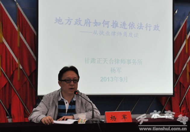 9月24日下午,天水市人民政府舉辦《地方政府如何推進依法行政》專題法制講座,邀請?zhí)m州大學法學院客座教授、碩士研究生校外輔導教師、甘肅正天合律師事務所副主任楊軍就地方政府如何推進依法行政進行了專題輔導。