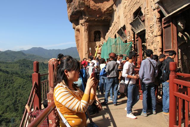 10月1日,麥積山風(fēng)景名勝區(qū)秋高氣爽,景色怡人, “十一”長假旅游第一天迎來“首日熱”。游客高峰期從早9點持續(xù)到下午4點左右。當日,景區(qū)內(nèi)的麥積山、仙人崖、石門、曲溪、溫泉等景點共接待游客15748人次,同比增長21%,其中麥積山石窟景區(qū)接待游客8260人次,仙人崖景區(qū)1580接待游客人次,與去年同期相比均有較大幅度增長。從游客來源和構(gòu)成看,呈現(xiàn)出本地和周邊客源為主,自駕游和散客居多,健身休閑為主的“驢友團”顯著增加的特點。