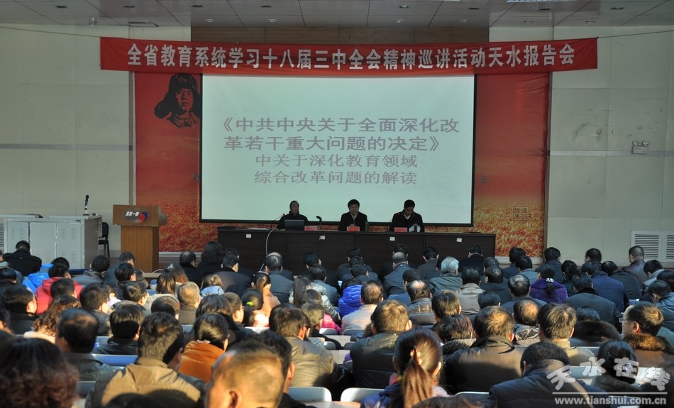 國家督學(xué)、省教育廳黨組成員、總督學(xué)李晶出席報(bào)告會(huì)并作了重要講話。他指出,在歲尾年初,各項(xiàng)工作進(jìn)入總結(jié)梳理和開局謀劃的關(guān)鍵節(jié)點(diǎn),天水舉行這項(xiàng)學(xué)習(xí)活動(dòng)意義重大,對增強(qiáng)全市教育系統(tǒng)深化教育改革的主動(dòng)性和責(zé)任性有很大的幫助。他要求全市教育工作者要把繼續(xù)深入學(xué)習(xí)十八屆三中全會(huì)精神和轉(zhuǎn)變觀念、提高認(rèn)識解放思想結(jié)合起來,和挖掘潛力、提升自身能力結(jié)合起來,和整合資源、創(chuàng)新體制機(jī)制結(jié)合起來,切實(shí)增強(qiáng)學(xué)習(xí)效果。