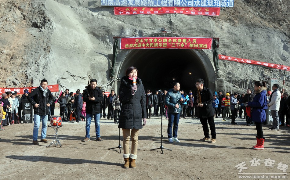 1月8日上午,中央民族樂(lè)團(tuán)“三下鄉(xiāng)”活動(dòng)小分隊(duì),來(lái)到天水市秦州區(qū)藉口鎮(zhèn)鄭集寨村,先后在貧困戶(hù)鄭全生、王榮娃家的農(nóng)家小院進(jìn)行了演出,并為他們送去大米、清油和慰問(wèn)金。隨后,小分隊(duì)趕赴天水甘麥公路琥珀隧道施工現(xiàn)場(chǎng)和天寶客專(zhuān)秦安梁場(chǎng)的工地,為正在施工的一線工人們表演了《好日子》《我是中國(guó)人》等節(jié)目,精彩的演出贏得了大家陣陣喝彩。1月9日晚,中央民族樂(lè)團(tuán)“三下鄉(xiāng)”活動(dòng)還走進(jìn)天水市交通運(yùn)輸系統(tǒng),為500多名職工進(jìn)行了專(zhuān)場(chǎng)慰問(wèn)演出。