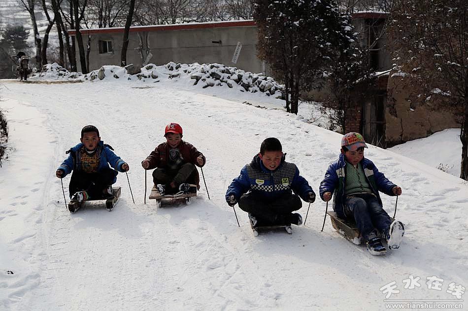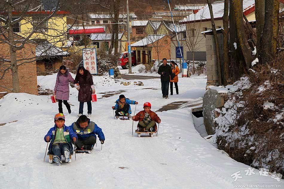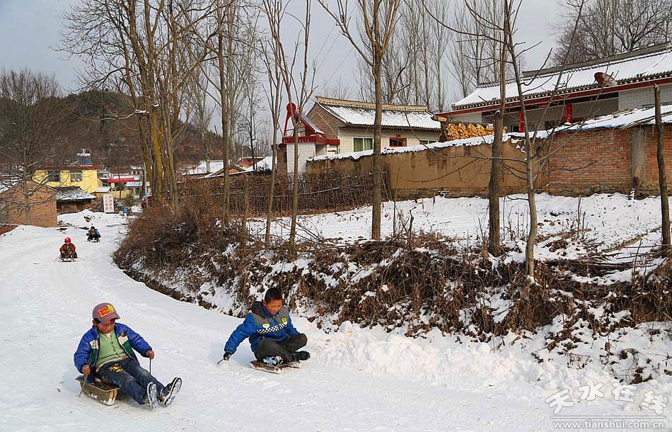 (圖為麥積山觀景臺(tái)后村莊的小孩在滑雪 天水在線攝影于2月9日下午 )