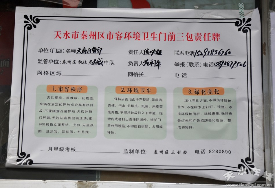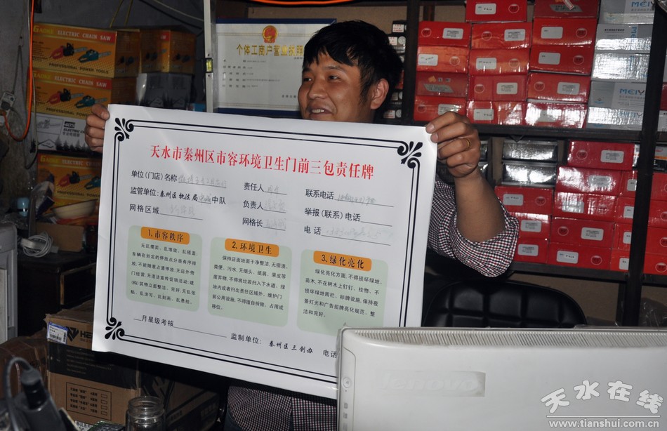 (在秦州區(qū)雙橋路檢查“門(mén)前三包”責(zé)任落實(shí)情況)