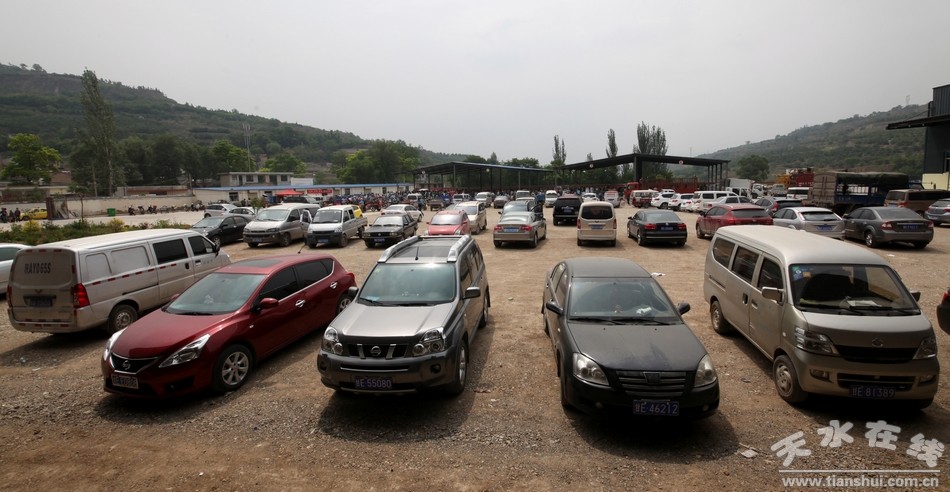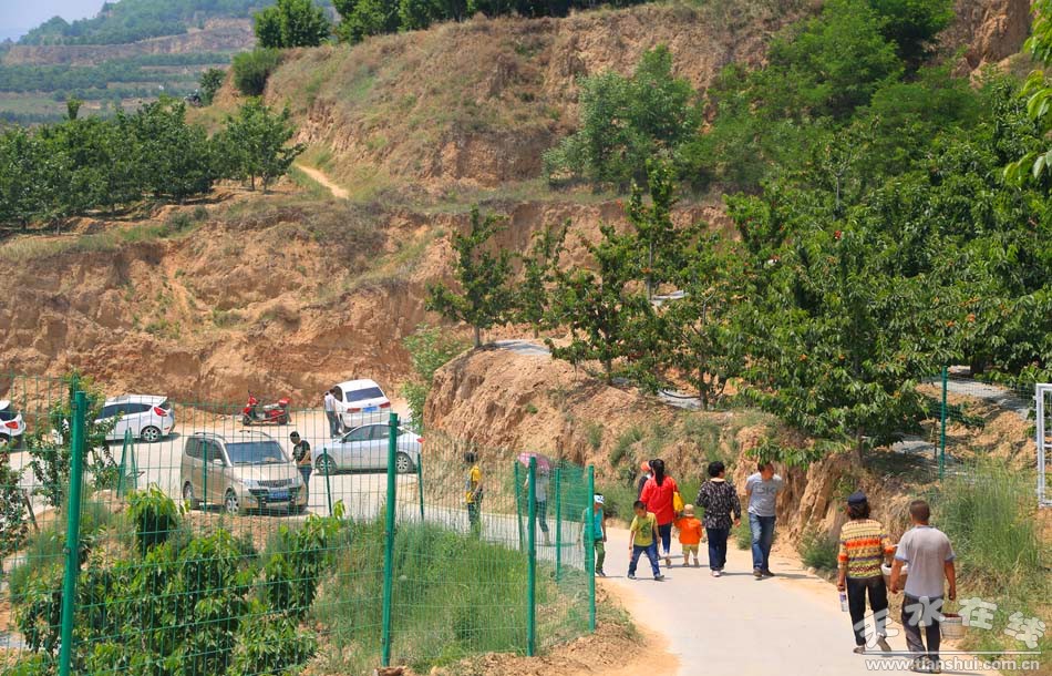 (即使是中午13時,天氣非常炎熱的情況下,煙鋪櫻桃園依然車水馬龍,游人如織。天水在線攝于6月1日)