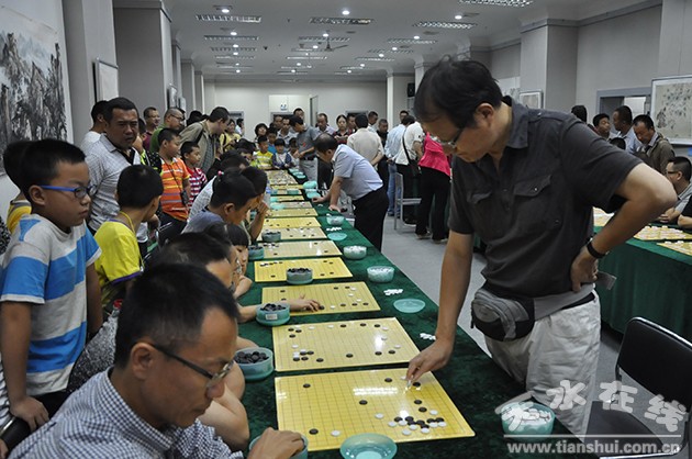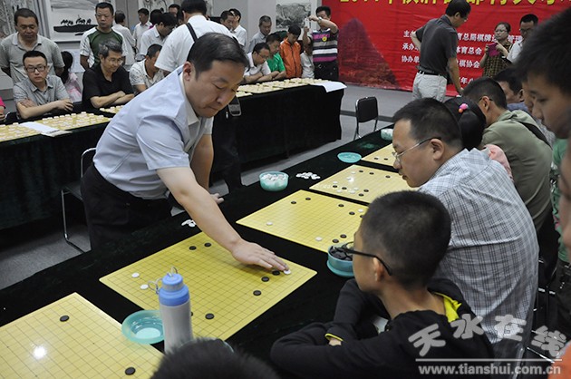8月14日,參加2014棋牌西部行活動(dòng)的棋牌國(guó)手,在天水金龍大酒店和我市選手互動(dòng)。