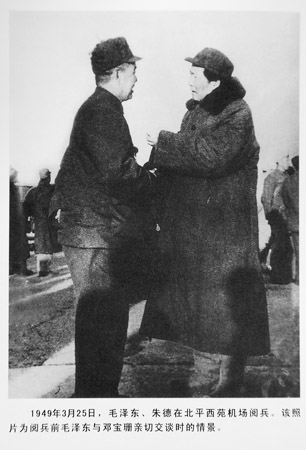 1949年3月25日,毛澤東、朱德在北平西苑機(jī)場(chǎng)閱兵。閱兵前毛澤東與鄧寶珊親切交談。
