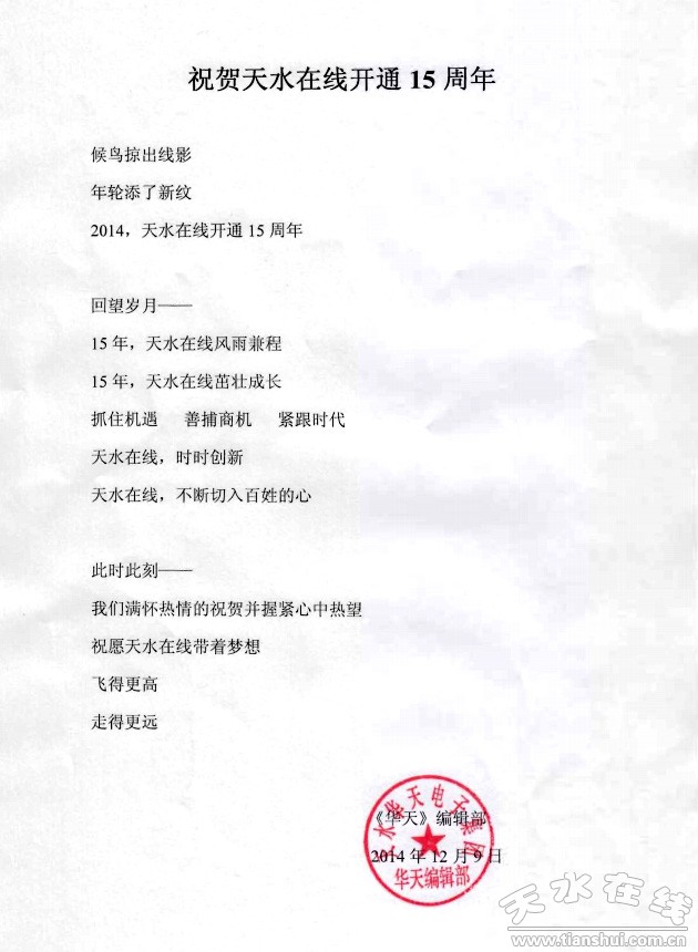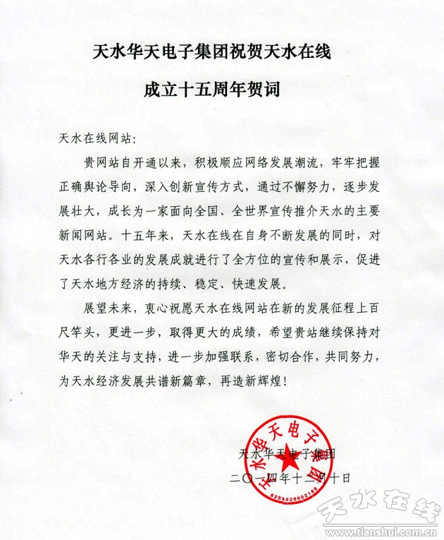 ·天水華天電子集團(tuán)電賀天水在線開通十五周年(圖)