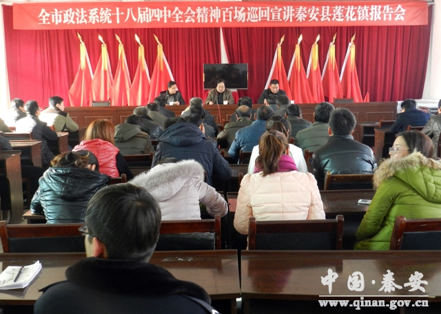 為深入學(xué)習(xí)貫徹黨的十八屆四中全會(huì)精神,進(jìn)一步鞏固和推動(dòng)黨的群眾路線教育實(shí)踐活動(dòng)成果,按照省委王三運(yùn)書記就學(xué)習(xí)貫徹黨的十八屆四中全會(huì)精神時(shí)提出的八個(gè)方面要求和省、市委關(guān)于學(xué)習(xí)宣傳貫徹黨的十八屆四中全會(huì)精神的通知要求,市委常委政法委書記趙衛(wèi)東明確提出全市政法系統(tǒng)和政法領(lǐng)導(dǎo)干部在學(xué)習(xí)宣傳貫徹黨的十八屆四中全會(huì)中的“兩前列、兩帶頭”的具體要求,天水市委政法委抽調(diào)市直政法部門及市法學(xué)會(huì)人員組成6個(gè)宣講團(tuán),分別深入全市123個(gè)鄉(xiāng)鎮(zhèn)(街道)、綜治維穩(wěn)防范邪教成員單位、鄉(xiāng)鎮(zhèn)(街道),組織開展黨的十八屆四中全會(huì)精神“百場(chǎng)巡回宣講”活動(dòng)。宣講以“弘揚(yáng)法治精神,全面推進(jìn)依法治國”為主題,從《決定》的主要內(nèi)容、創(chuàng)新亮點(diǎn)、領(lǐng)導(dǎo)干部法治思維和社會(huì)矛盾糾紛化解等方面,深入宣講依法治國的重大意義、總目標(biāo)、科學(xué)內(nèi)涵、重大任務(wù)等,對(duì)黨的十八屆四中全會(huì)精神進(jìn)行了全面系統(tǒng)地解讀。本次巡回宣講活動(dòng)從2014年12月中旬開始至2015年1月中旬結(jié)束,共開展了137場(chǎng)宣講報(bào)告,向全市12000余名基層政法干警、綜治維穩(wěn)防范邪教成員單位、鄉(xiāng)鎮(zhèn)(街道)、村(社區(qū))基層干部和群眾受到教育,有效地推動(dòng)了全市學(xué)習(xí)宣傳貫徹全會(huì)精神的熱潮,進(jìn)一步增強(qiáng)了基層廣大政法干警和縣鄉(xiāng)村從事政法工作的基層干部用四中全會(huì)精神指導(dǎo)實(shí)踐、武裝頭腦、推動(dòng)工作的意識(shí),提升了運(yùn)用法治思維和法治方式做好新形勢(shì)下政法工作、提高政法工作法制化水平的能力。