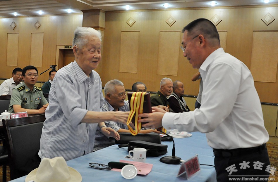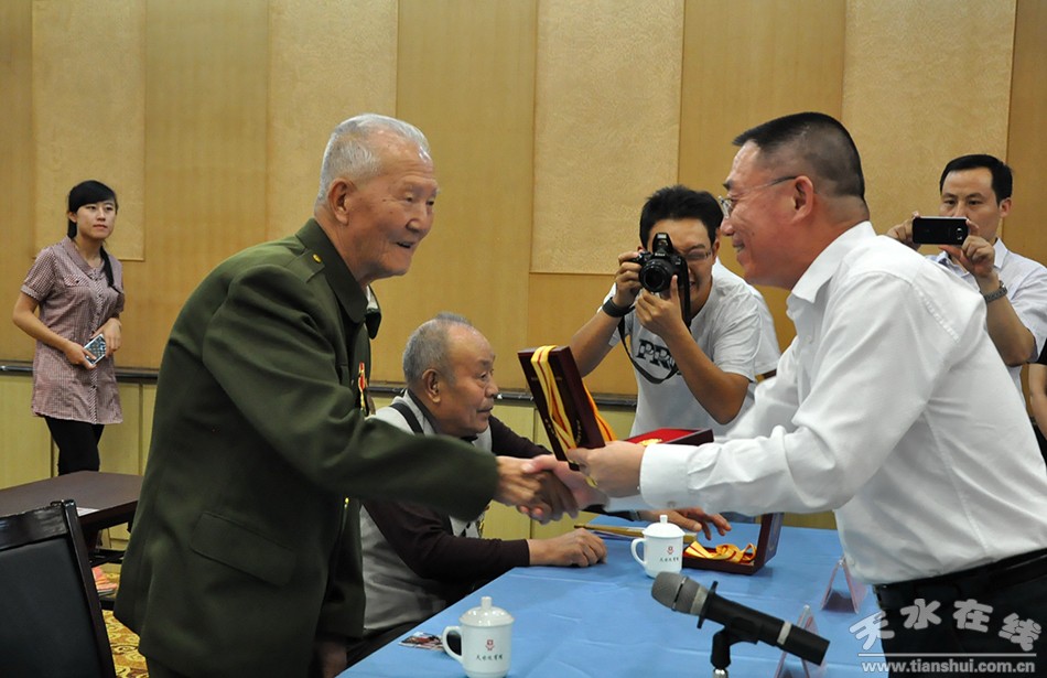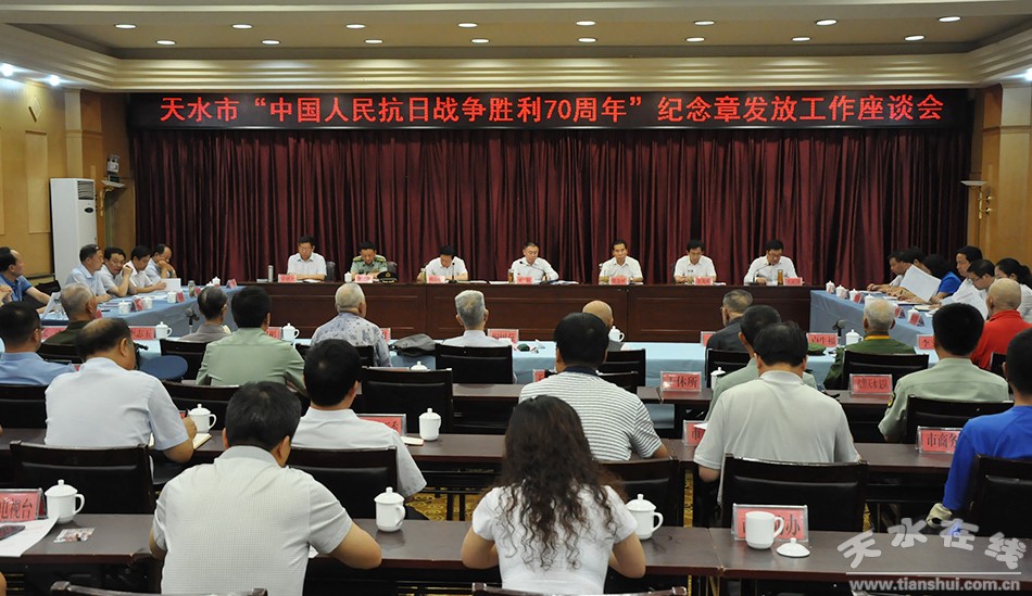在中國(guó)人民抗日戰(zhàn)爭(zhēng)暨世界反法西斯戰(zhàn)爭(zhēng)勝利70周年紀(jì)念日到來(lái)之際,近日,天水市召開(kāi)抗日戰(zhàn)爭(zhēng)勝利70周年紀(jì)念章發(fā)放工作座談會(huì),向抗戰(zhàn)老戰(zhàn)士代表頒發(fā)紀(jì)念章,與老戰(zhàn)士共同回顧抗戰(zhàn)歷史,緬懷革命先烈,弘揚(yáng)偉大的抗戰(zhàn)精神。市委書(shū)記王銳為老戰(zhàn)士代表頒發(fā)紀(jì)念章并講話(huà)。