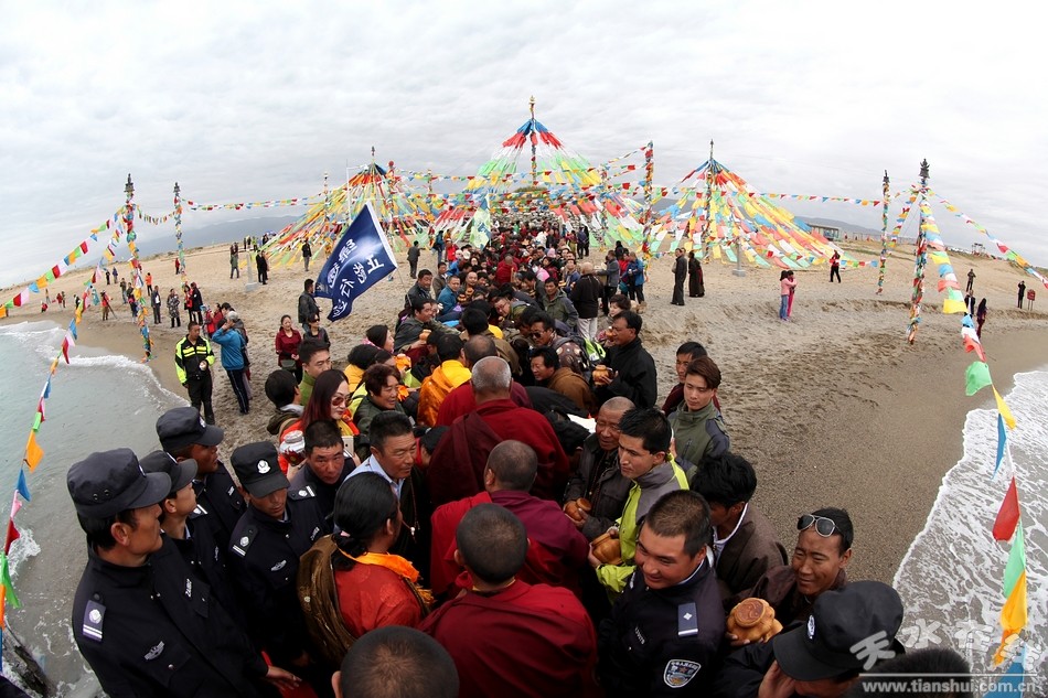 青海湖大規(guī)模的祭;顒(dòng)起源于雍正年間。雍正二年,大將軍年羹堯率部平定青海蒙古族首領(lǐng)丹津叛亂,追擊叛軍到青海湖時(shí),大軍飲用水開始出現(xiàn)短缺。而此時(shí)遠(yuǎn)處所來一隊(duì)騎兵所騎戰(zhàn)馬中,有幾個(gè)馬蹄正踏到了地上泉眼,頓時(shí)噴涌而出的淡水解決了軍隊(duì)飲水問題。士氣大振的將士們一鼓作氣,殲滅了叛軍。雍正帝聽聞后,詔封“靈顯宣威青海湖”,御賜神位,安放到青海海神廟內(nèi)并詔于每年秋八月(農(nóng)歷七月十五日)定期祭海,從此便開始大規(guī)模祭;顒(dòng)。