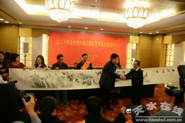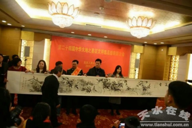 11月22日上午九時(shí),中華大地征文頒獎(jiǎng)大會(huì)在北京人民大會(huì)堂舉行,全國人大常委會(huì)副委員長周鐵農(nóng)為獲獎(jiǎng)?wù)哳C發(fā)獎(jiǎng)杯。會(huì)議期間,由張?jiān)鱿榫脑O(shè)計(jì)策劃,并由中國慈善家,中國美術(shù)家協(xié)會(huì)會(huì)員,中國美術(shù)家協(xié)會(huì)天水創(chuàng)作寫生基地主任趙萬順先生創(chuàng)作的七米畫卷《壯志凌雲(yún)》作品委托張?jiān)鱿槿珯?quán)負(fù)責(zé)贈(zèng)送中華大地之光組委會(huì),組委會(huì)主任阮觀榮接受贈(zèng)品,并與張?jiān)鱿橛H切握手表示謝意!CCTV記者現(xiàn)場錄制贈(zèng)送過程。