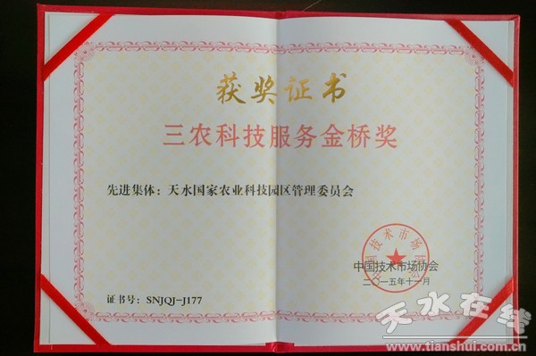 11月26-29日先后在四川省成都和廣元兩市召開的全國第二屆“三農(nóng)科技服務(wù)金橋獎”上獲悉,天水國家農(nóng)業(yè)科技園區(qū)管理委員會被中國技術(shù)市場協(xié)會金橋獎評審委員會評為全國第二屆 “三農(nóng)科技服務(wù)金橋獎”先進(jìn)集體。全國“先進(jìn)集體”獎勵的獲得,是對天水國家農(nóng)業(yè)科技園區(qū)2015年科技服務(wù)三農(nóng)工作的充分肯定和褒獎。這次“三農(nóng)科技服務(wù)金橋獎”全國共評出先進(jìn)集體254個,先進(jìn)個人396名,優(yōu)秀項目151項。