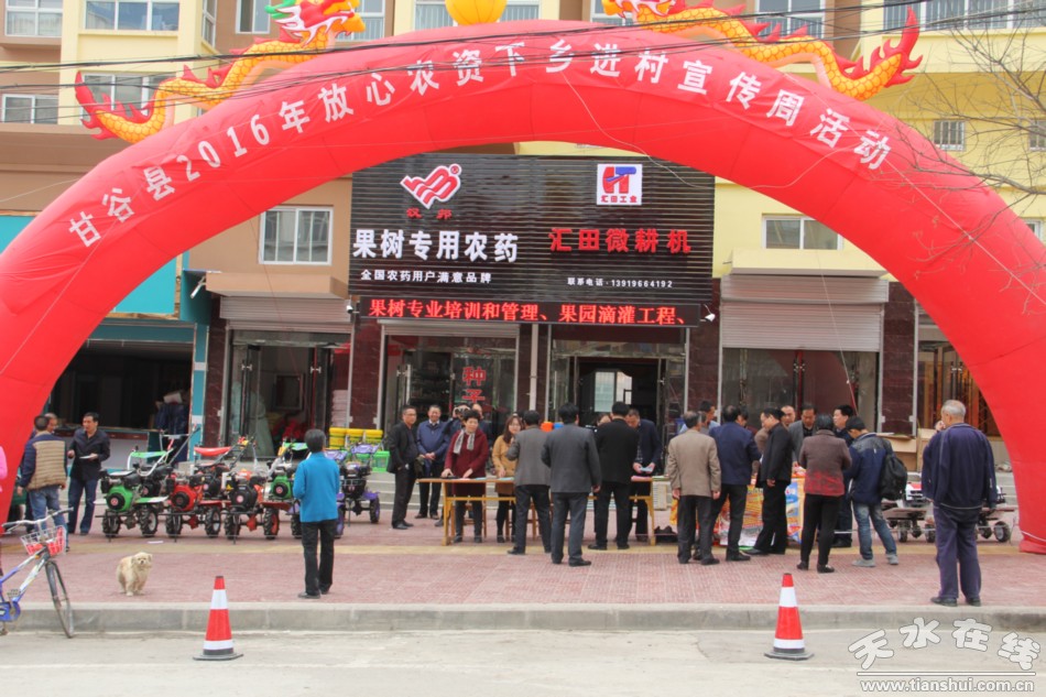 天水市于2016年3月30日—4月15日在全市開(kāi)展了以“放心農(nóng)資下鄉(xiāng)進(jìn)村,監(jiān)管服務(wù)到基層”為主題的“放心農(nóng)資下鄉(xiāng)進(jìn)村宣傳周”活動(dòng);顒(dòng)期間,全市各縣區(qū)通過(guò)舉辦大型咨詢(xún)活動(dòng)、開(kāi)辦培訓(xùn)班、組織優(yōu)質(zhì)農(nóng)資下鄉(xiāng)推介等形式向農(nóng)民宣傳農(nóng)業(yè)和農(nóng)資管理的法律法規(guī),介紹識(shí)別真假農(nóng)資的常識(shí),講解科學(xué)使用農(nóng)資的知識(shí),宣傳名優(yōu)農(nóng)資企業(yè)和品牌,組織放心農(nóng)資下鄉(xiāng)進(jìn)村,提高農(nóng)民維權(quán)意識(shí)和自我保護(hù)的能力,在全社會(huì)營(yíng)造了誠(chéng)信銷(xiāo)售農(nóng)資、放心消費(fèi)農(nóng)資、科學(xué)使用農(nóng)資的良好氛圍。