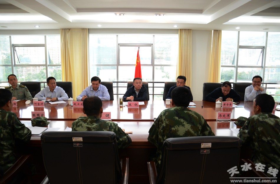 調(diào)研中,王銳一行先后深入武警天水市支隊(duì)原教導(dǎo)隊(duì)、天水市軍警民訓(xùn)練基地和武警天水市支隊(duì)機(jī)關(guān),詳細(xì)了解部隊(duì)建設(shè)情況,在隨后召開(kāi)的座談會(huì)上,聽(tīng)取了武警天水市支隊(duì)工作匯報(bào),并就支隊(duì)營(yíng)房建設(shè)、特戰(zhàn)裝備配備、情報(bào)互通機(jī)制建設(shè)等問(wèn)題提出了指導(dǎo)性的意見(jiàn)。