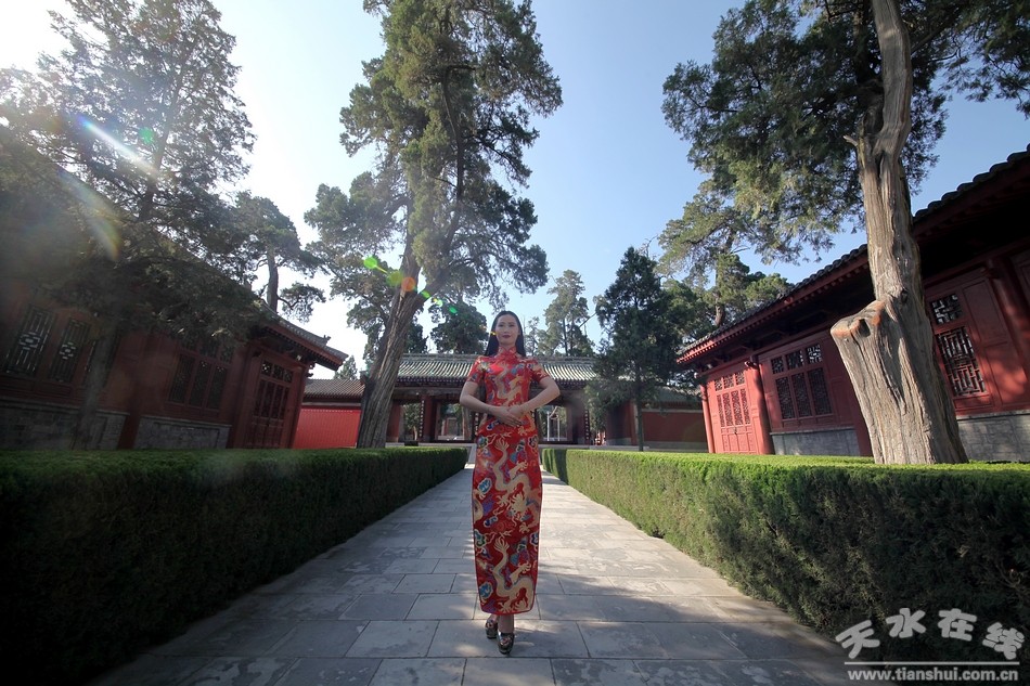 ▲6月6日,擬擔(dān)任2016(丙申)年公祭伏羲大典首席禮儀小姐的王姜樂在伏羲廟進(jìn)行訓(xùn)練。 |