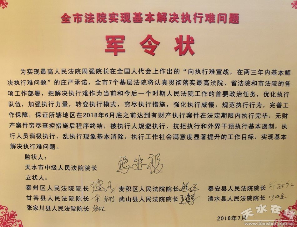 (天水市中級(jí)人民法院院長(zhǎng)馬忠福與各縣區(qū)法院院長(zhǎng)簽訂“全市法院實(shí)現(xiàn)基本解決執(zhí)行難問題軍令狀” )