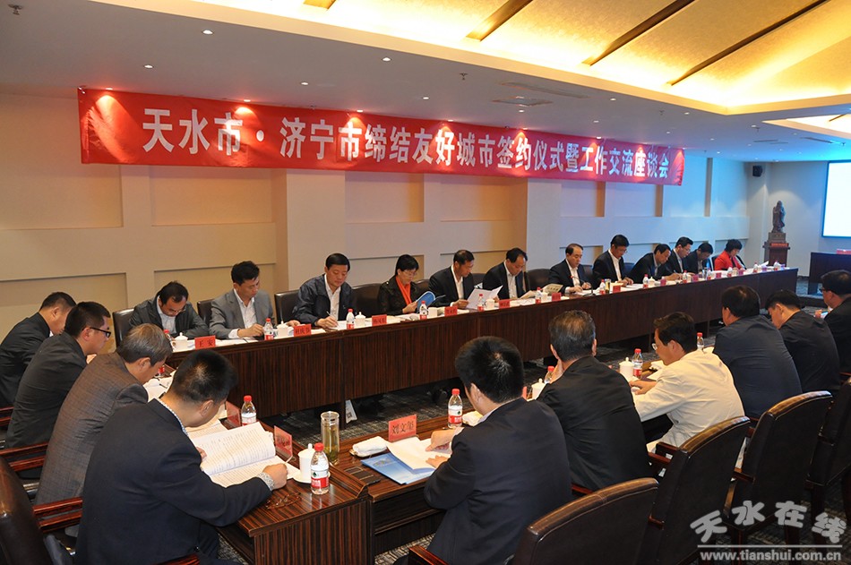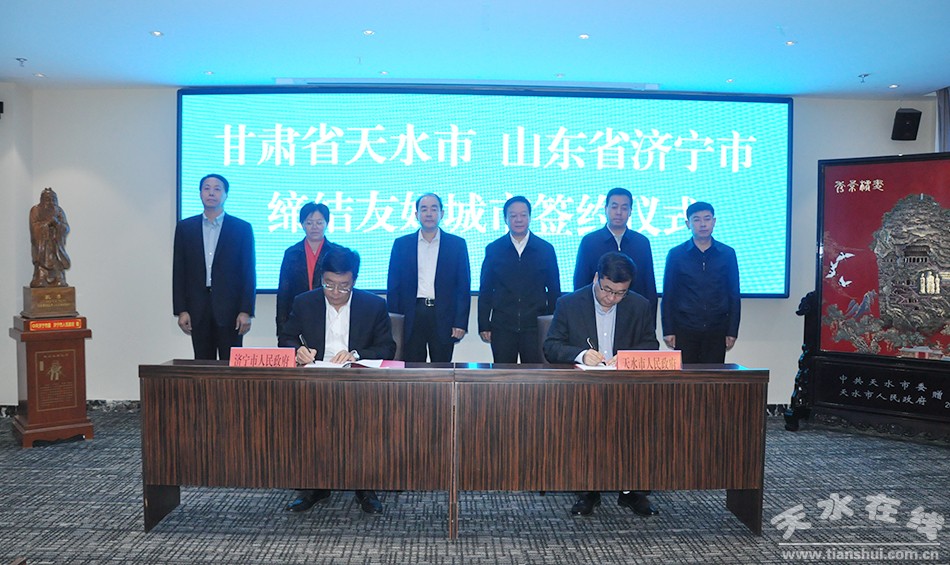。ㄌ焖形N⑿麄鞑块L(zhǎng)王正茂,濟(jì)寧市委常委、宣傳部長(zhǎng)、曲阜文化建設(shè)示范區(qū)黨工委書記李昌文分別代表天水、濟(jì)寧簽訂了友好城市協(xié)議。 )