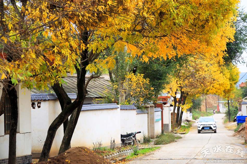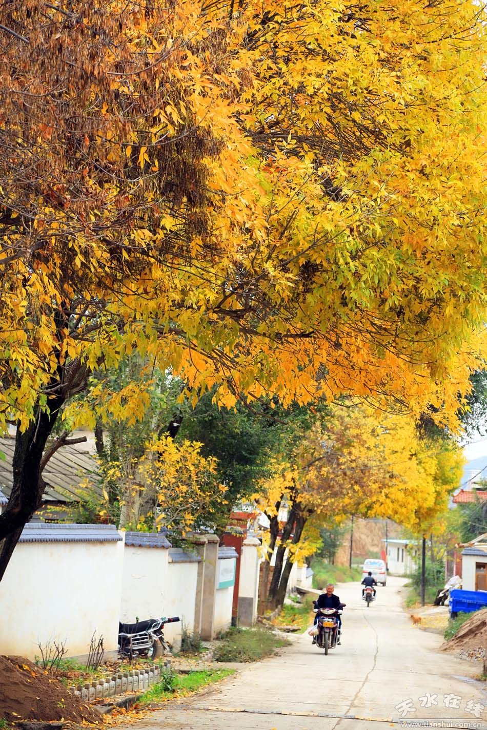 10月23日,“霜降”,以出產“煙鋪大櫻桃”而聞名天下的天水市秦州區(qū)玉泉鎮(zhèn)煙鋪村村路兩旁的樹葉變成了金黃色,村民途經該路段,宛若進入了“金光大道”,美不勝收。近年來,煙鋪村大力發(fā)展櫻桃產業(yè),“煙鋪大櫻桃”持續(xù)豐產豐收,村民的生活也走上了“金光大道”。