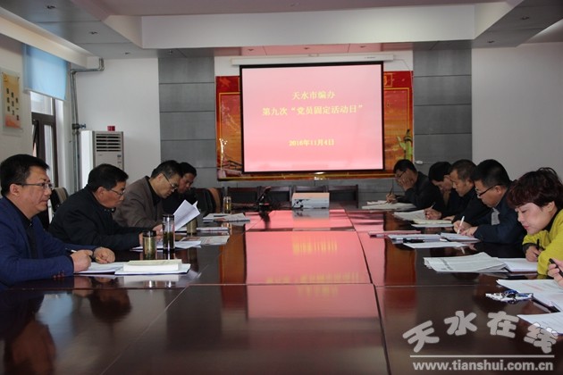 在“兩學一做”學習教育中,11月4日,市編辦組織開展第九次“黨員固定活動日”,集中學習傳達黨的十八屆六中全會和市七次黨代會精神。市編辦主任李吉祺主持會議,市編辦全體黨員干部參加。