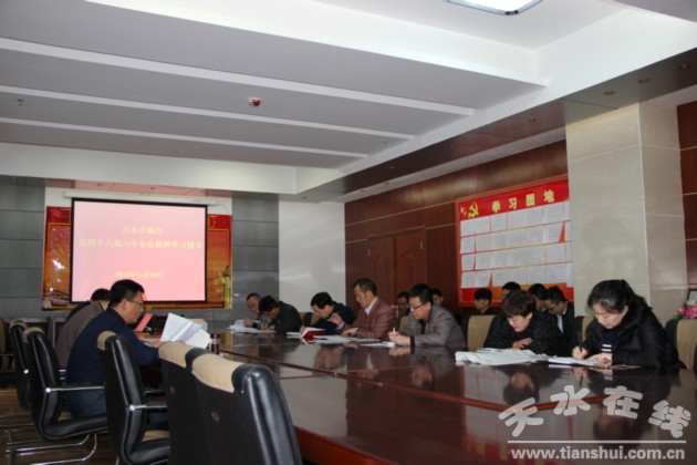 為了深入學(xué)習(xí)貫徹黨的十八屆六中全會精神,繼11月4日集中學(xué)習(xí)十八屆六中全會會議公報(bào)之后,11月22日,天水市編辦利用半天時間組織開展十八屆六中全會學(xué)習(xí)輔導(dǎo)會,市編辦主任李吉祺主持會議,市編辦全體黨員干部參加。