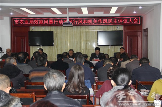 12月2日,天水市農(nóng)業(yè)局召開了2016年效能風(fēng)暴行動(dòng)政風(fēng)行風(fēng)和機(jī)關(guān)作風(fēng)民主評(píng)議大會(huì)。市農(nóng)業(yè)局領(lǐng)導(dǎo)、市民評(píng)代表、局民評(píng)代表、局屬各站所干部職工、機(jī)關(guān)全體干部共計(jì)60余人參加了會(huì)議。