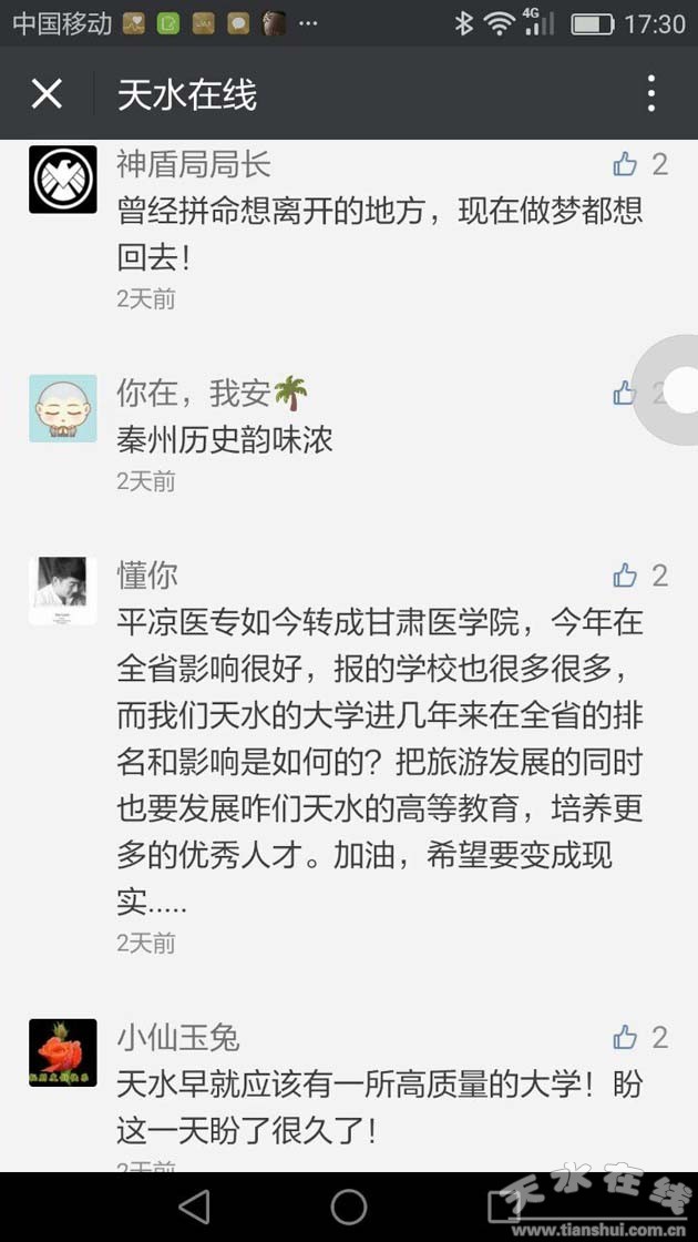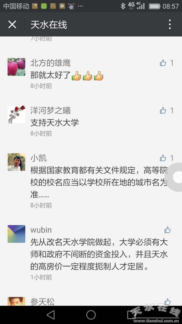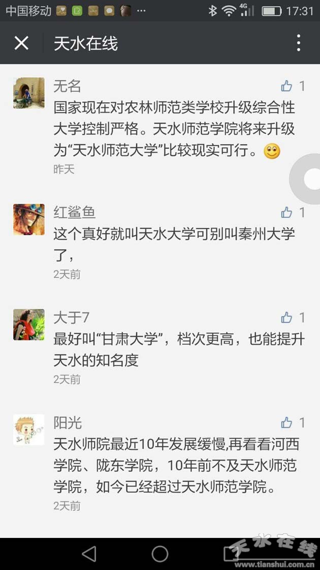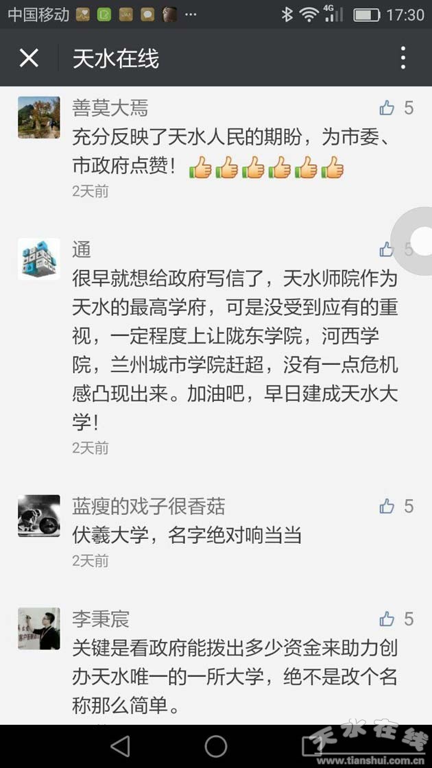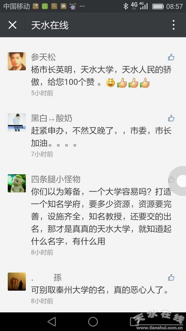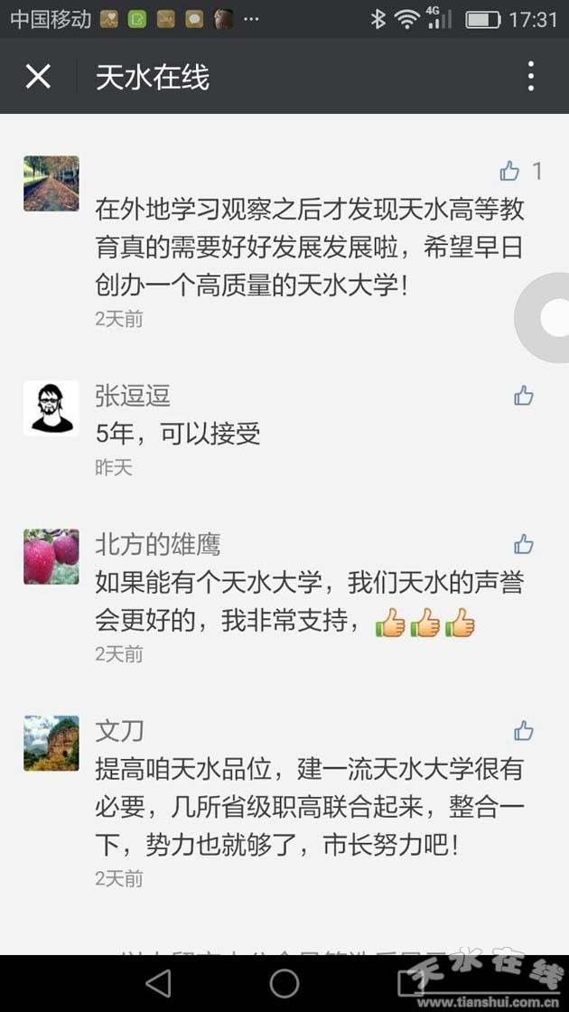 天水在線12月4日報道 天水市委副書記、市長楊維俊11月30日來到天水師范學院,就我市高等教育發(fā)展工作進行調(diào)研。楊維俊指出,天水市教育資源豐富,全市有高職學院、普通中專等各級各類院校30多所,工業(yè)、林業(yè)、農(nóng)業(yè)、醫(yī)學等專業(yè)門類齊全,整合優(yōu)化職業(yè)教育資源、創(chuàng)辦天水大學具有較好基礎,也符合國家關于加快教育改革發(fā)展的政策精神。要結(jié)合天水實際,加強與省教育廳等部門的匯報溝通,最大程度地整合優(yōu)化天水高等教育和職業(yè)教育資源,積極探索加快高等教育改革發(fā)展和職業(yè)教育整合優(yōu)化的運行機制和管理模式,為早日創(chuàng)辦天水大學、推動天水高等教育實現(xiàn)更高層次發(fā)展不懈努力。該新聞經(jīng)天水在線網(wǎng)站和天水在線微信公眾號發(fā)布后,立即引發(fā)網(wǎng)民熱議,F(xiàn)將網(wǎng)民留言發(fā)布如下: