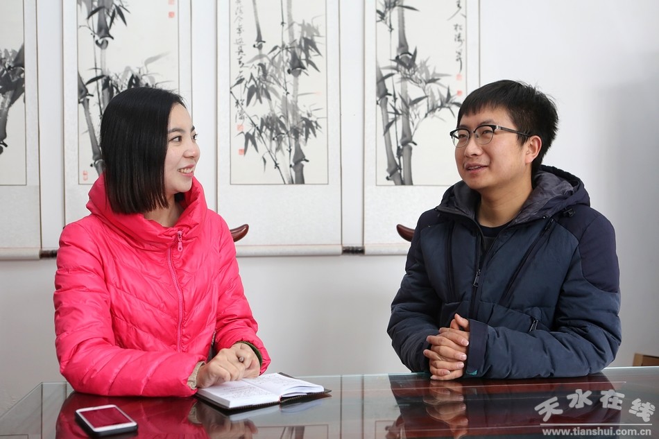 △天水在線記者2月3日在大坪村采訪人民日報記者王錦濤(右)