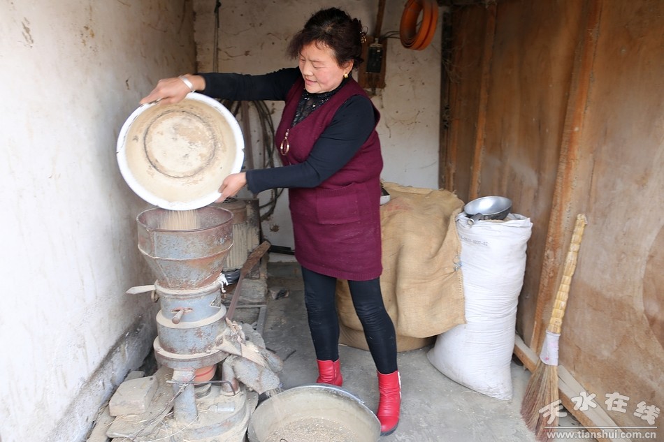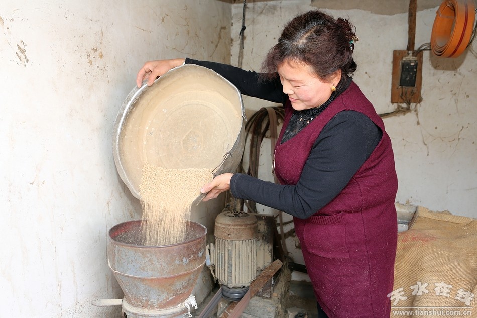在盆子里擇好顆粒飽滿的小麥后,就該倒進(jìn)剝皮機(jī)里去皮了。剝皮機(jī)內(nèi)有砂輪、篩片和磨米刀,機(jī)身下有個小麥出口,后面是個排糠通道,伴隨著一陣噼噼啪啪的響聲,剝好皮的小麥源源不斷地落進(jìn)了大盆子里!艾F(xiàn)在有了剝皮機(jī),省去了手工剝皮的時間,人輕松了好多!笨粗枳永飫兺昶さ男←湞u漸堆成了小山,張雙銀笑著對我們說,有了剝皮機(jī),小麥的破碎率降低了,排糠量也明顯多了,做出來的甜醅更香糯好吃。