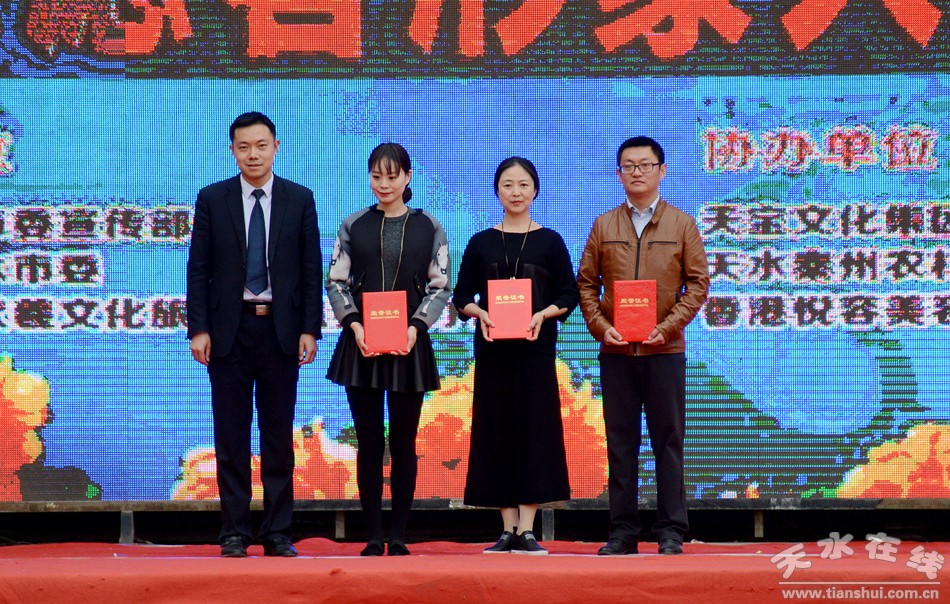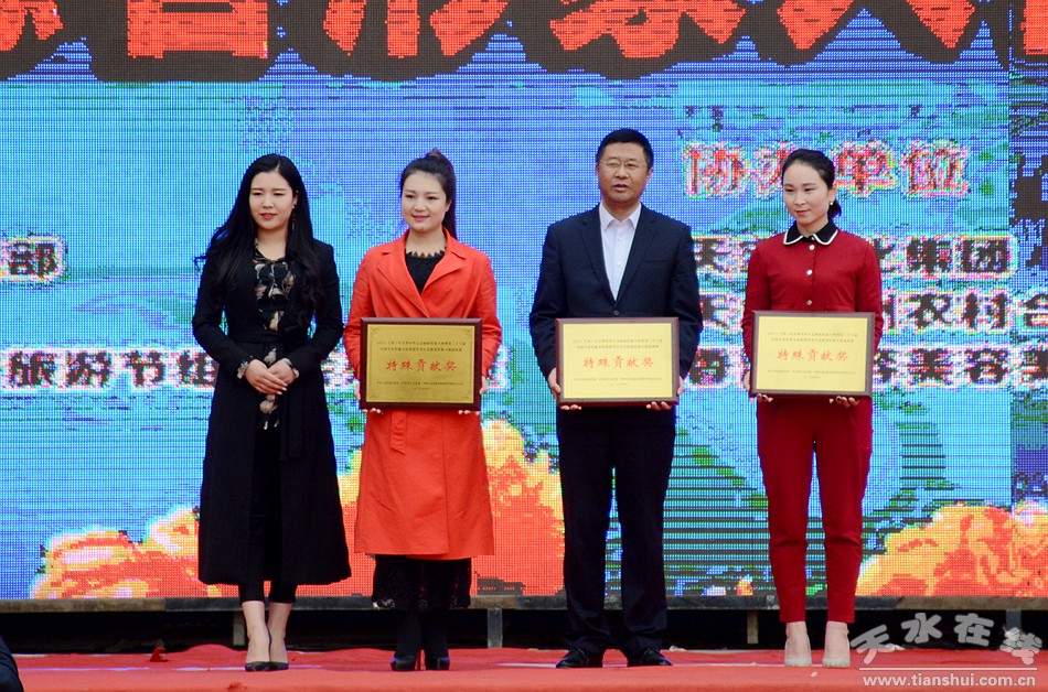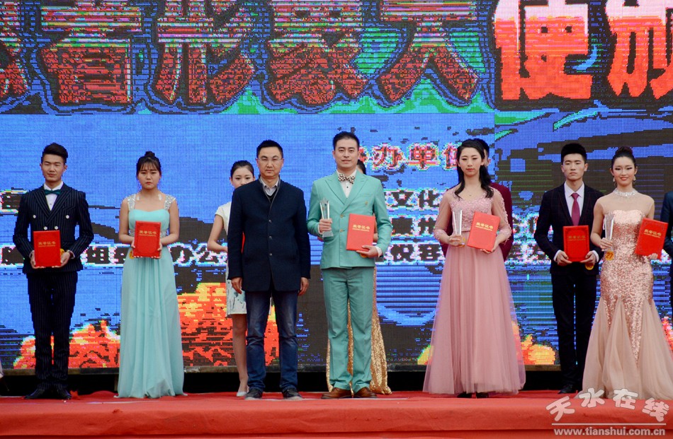 (天水市委宣傳部副部長趙子洲、市文明辦主任張秀麗為榮獲大賽形象大使稱號(hào)選手頒獎(jiǎng))