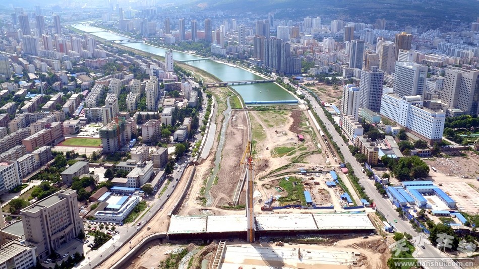 (正在建設(shè)中的藉河紅橋 天水在線2016年7月30日航拍)