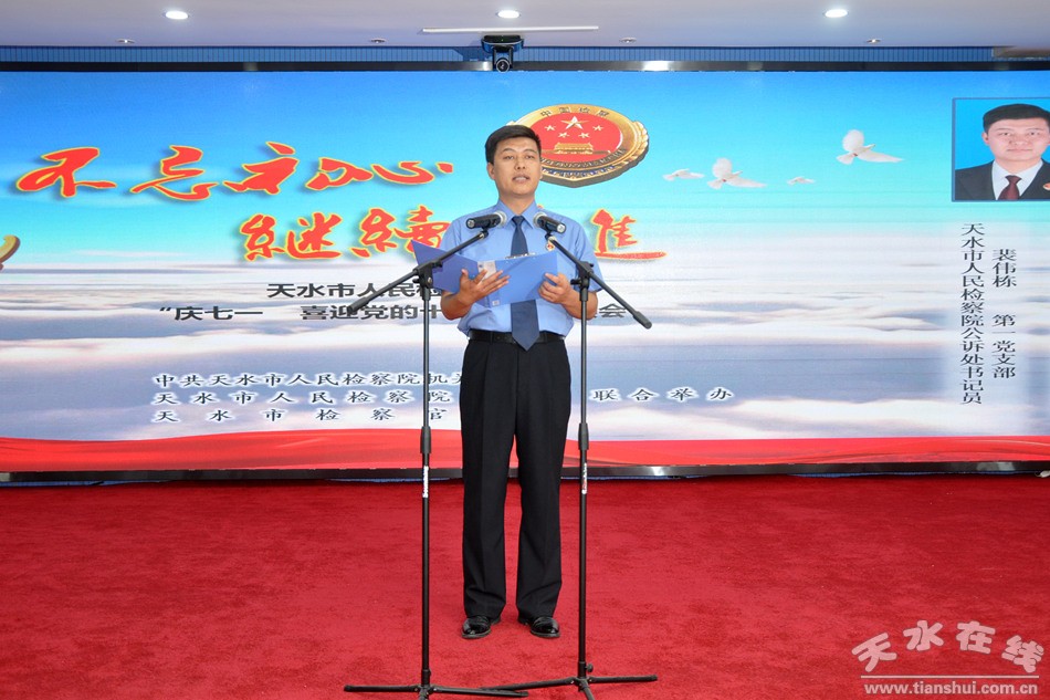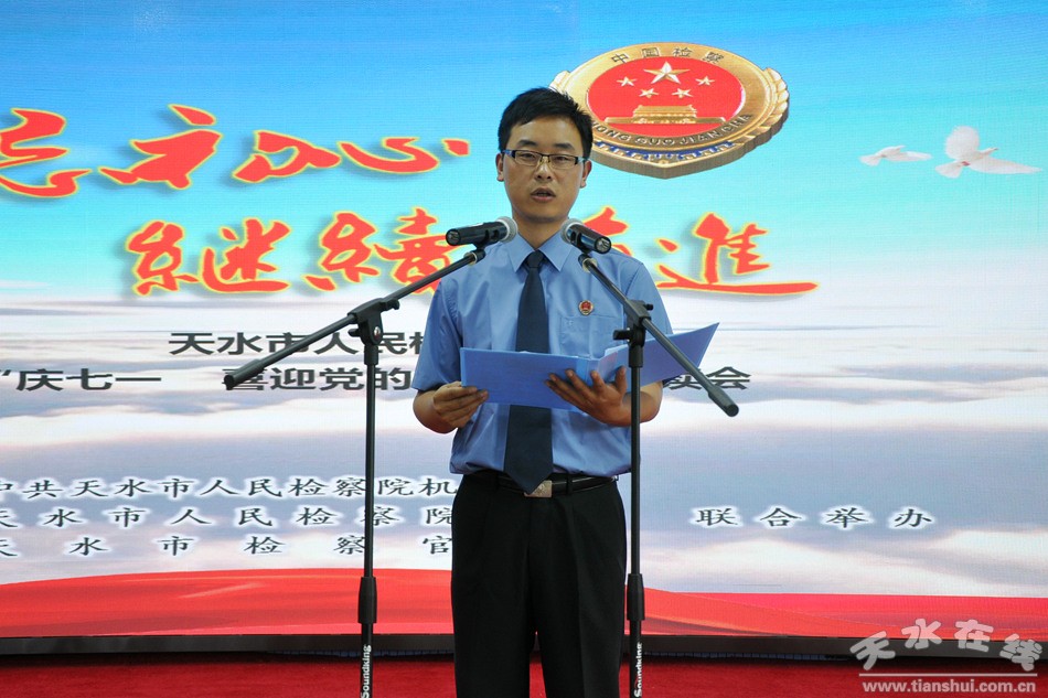 為慶祝中國共產(chǎn)黨建黨九十六周年,喜迎黨的第十九次全國代表大會(huì)的勝利召開。6月30日,天水市人民檢察院隆重舉辦“不忘初心、繼續(xù)前進(jìn)——慶七一,喜迎黨的十九大”誦讀會(huì)。誦讀會(huì)由市院機(jī)關(guān)黨委、檢察官文聯(lián)、工會(huì)聯(lián)合舉辦,檢察長張發(fā)魁、常務(wù)副檢察長戴金旺、副檢察長李春熙、田彬、曹義等市檢察院領(lǐng)導(dǎo)班子成員,及全體檢察干警共100余人參加了朗讀會(huì)。