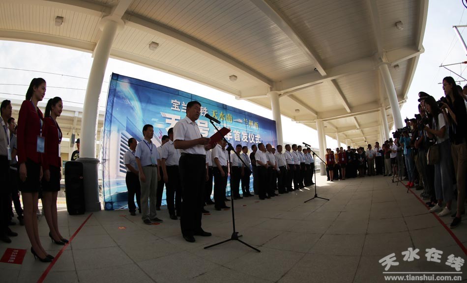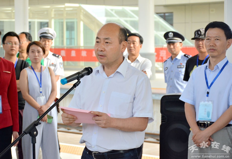 蘭州鐵路局副局長(zhǎng)高金陽(yáng)講話。天水市委常委、常務(wù)副市長(zhǎng)趙衛(wèi)東主持首發(fā)儀式。市領(lǐng)導(dǎo)蔣曉強(qiáng)、蒲軍、雷鳴、王正茂、蒲朝暉、劉天波、張建杰、郭明興、唐宏偉、逯克宗等出席首發(fā)儀式。